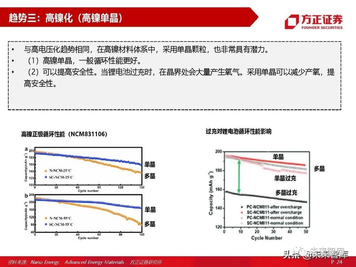 正极材料可以分为多晶和单晶。一般多晶材料是以微米级别的团聚体形式存在。团聚体内部存在 大量晶界。在电池充放电过程中,由于各向异性的晶格变化,多晶材料容易出现晶界开裂,导致 二次颗粒发生破碎。从而导致副反应快速增加,阻抗上升,性能快速下降等。采用单晶颗粒,可以减少晶界,减少副反应的发生,还能提高压实密度,从而提高能量密度。与多晶相比,单晶材料的循环性能一般会好很多。