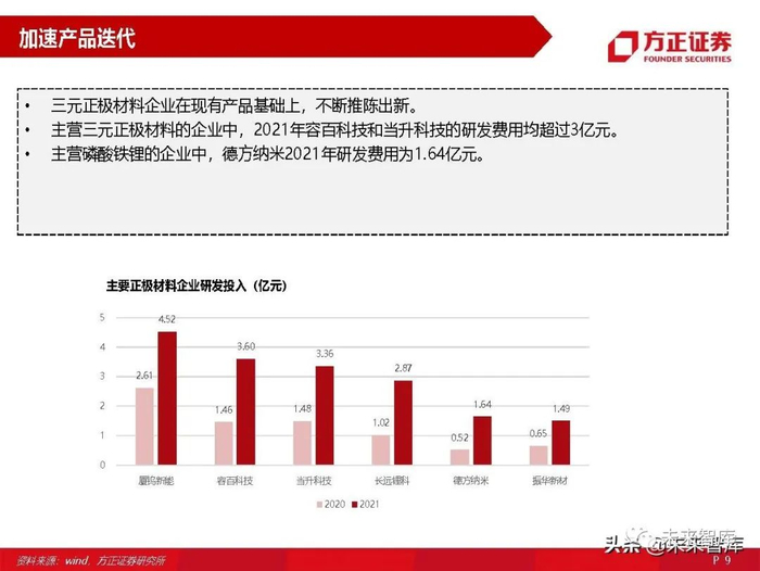 三元正极材料企业在现有产品基础上,不断推陈出新。主营三元正极材料的企业中,2021年容百科技和当升科技的研发费用均超过3亿元。主营磷酸铁锂的企业中,德方纳米2021年研发费用为1.64亿元。