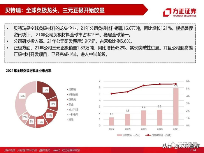 贝特瑞是全球负极材料的龙头企业。21年公司负极材料销量16.6万吨,同比增长121%。根据鑫椤 资讯统计, 21年公司负极材料全球市占率19%,稳居全球第一。公司研发投入高。21年公司研发费用5.9亿元,占营收比例5.6%。正极方面,21年公司三元正极销量1.83万吨,同比增长452%,实现突破性进展。并且公司超高镍 正极材料开发项目,已经完成小试,进入中试阶段。