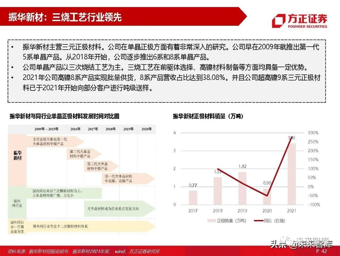 振华新材主营三元正极材料。公司在单晶正极方面有着非常深入的研究。公司早在2009年就推出第一代 5系单晶产品。从2018年开始,公司逐步推出6系和8系单晶产品。公司单晶产品以三次烧结工艺为主。三烧工艺在前驱体选择、高镍材料制备等方面均具备一定优势。2021年公司高镍8系产品实现批量供货,8系产品营收占比达到38.08%。并且公司超高镍9系三元正极材 料已于2021年开始向部分客户进行吨级送样。