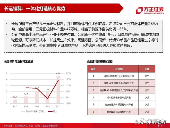 长远锂科主要产品是三元正极材料,并且前驱体自供比例较高。21年公司三元前驱体产量2.89万 吨,全部自用,三元正极材料产量4.47万吨,相当于前驱体自供比例~65%。公司中镍高电压产品在行业处于领先位置。公司新一代中镍高电压65 系单晶产品采用低成本粗颗 粒锂源,可以降低成本,并提高生产效率。高镍方面,公司新一代镍83单晶产品已经通过宁德时 代吨级样品测试。公司超高镍 9 系单晶产品,下游客户已经进入吨级试产阶段。