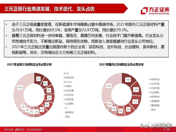 由于三元正极能量密度高,在新能源车市场稳稳占据中高端市场。2021年国内三元正极材料产量 为39.81万吨,同比增长89.5%;全球产量为72.97万吨,同比增长79.3%。随着三元正极材料进一步向单晶、高电压、高镍方向发展,行业技术门槛不断提高。行业龙头公 司凭借技术实力,不断推出新品,保持领先优势。而新进入者很难撼动行业龙头公司地位。