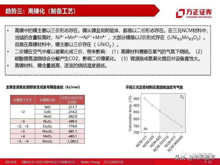 国内三元正极的两个发展方向存在一定的竞争:中镍高电压和高镍(常规电压)。从能量密度指标上来看,对于中镍高电压6系产品,充电截止电压4.4V,6系正极材料的能量密度 可以做到接近镍83的水平。从热稳定性指标上来看,中镍高电压产品一般好于高镍。622充电电压到4.5V,热分解温度比811 高,放热量比811小。