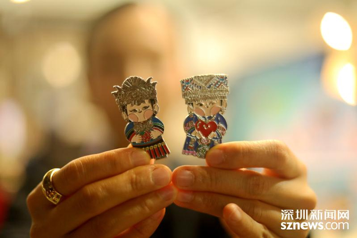 邓卓越展示她设计的“民族娃娃”配套徽章。