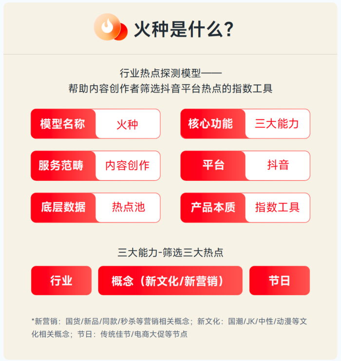 「火种」模型依赖的指数由三部分变量共同决定:内容覆盖力、内容增长力以及达人吸引力。通过三部分数据的整合计算,商家和内容创作者能够快速发现哪些话题正在或将要在短视频引爆。