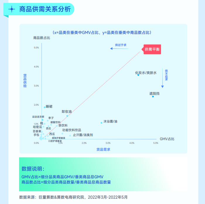 总的来说,内容供需关系分析能够指导商家和达人的内容创作方向,而商品供需关系分析则突出了更直接的市场需求机会。借助内容和商品两个层面的供需关系分析,商家和达人可以将有限的生产资源配置在最可能带来增长的领域,实现消费者需求、达人内容和商品三者间的最优适配。