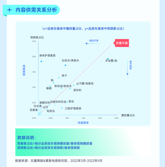 在最新的「6月趋势种草指南」中,商家和达人便能够快速发掘市场增长机会。以内容供需关系分析为例,通过比较观看数占比和视频数占比,能够看到身体护理套装、化妆水/爽肤水、睡裙等品类的内容处于供过于求的状态,达人和商家在这些赛道生产内容面临着更严峻的挑战。以身体护理套装为例,这个领域产出了大量内容但并用户观看兴趣缺乏,这种情况势必需要商家调整策略。