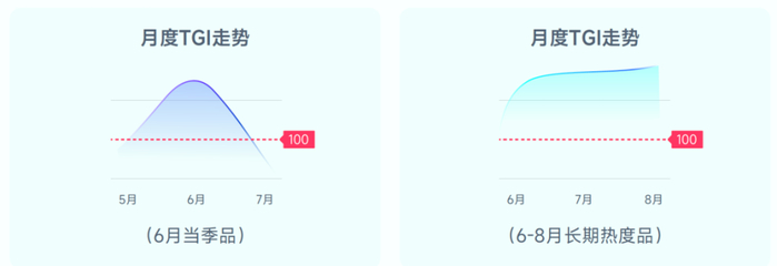 比如它以品类为颗粒度分析了不同月份的TGI表现,TGI是用来反映相关品类强弱势程度的指数。经过计算后,报告将潜力品类又细分为「当季品」和「长期热度品」两类:前者是只在6月快速增长的品类,后者则是在未来三个月都将受到追捧的赛道。