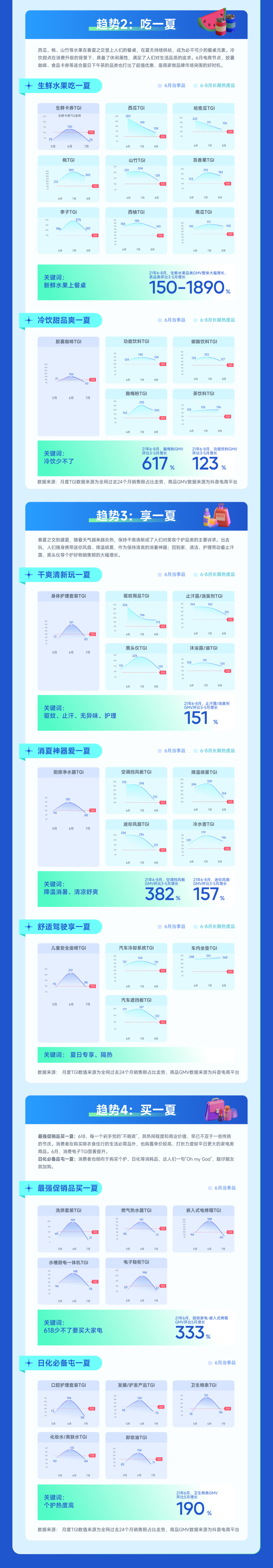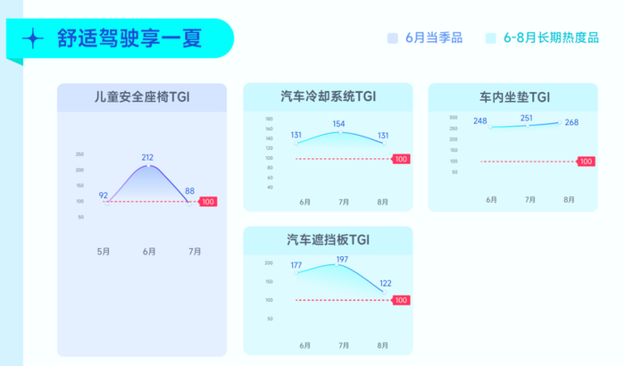 而T恤、折扇、凉鞋拖鞋、酸梅粉、黑头仪、降温喷雾等则属于「6-8月长期热度品」,这些赛道中的企业可以进行长周期布局。比如酸梅粉未来三个月的TGI指数就持续处于200上下的高位,展现了可观的市场增长空间。值得注意的是即便是「长期热度品」,不同品类的TGI指数走势也不尽相同,企业可以跟随轨迹精确调整运营策略——例如T恤、驱蚊用品等就呈现出逐月下滑的态势,这提醒企业应该遵从先猛烈、后收缩的运营逻辑;而功能饮料、沐浴露、汽车冷却系统等品类则相对稳定,商家可以平稳发力、步步为营。