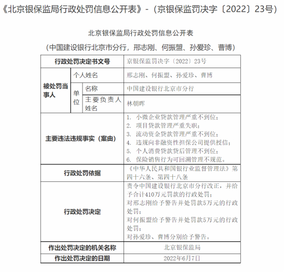 国有行、股份行分支机构也被开出大罚单。6月7日,中国建设银行北京市分行因小微企业贷款管理严重不到位、项目贷款管理严重失职、流动资金贷款管理严重不到位、违规向非融资性担保公司提供授信、个人消费贷款贷后管理不到位等6项违法违规行为被罚410万元。