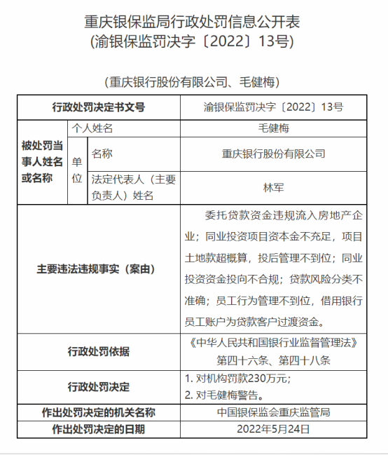 例如,重庆银行被罚款230万元,案由包括:同业投资项目资本金不充足,项目土地款超概算,投后管理不到位;同业投资资金投向不合规;员工行为管理不到位,借用银行员工账户为贷款客户过渡资金。