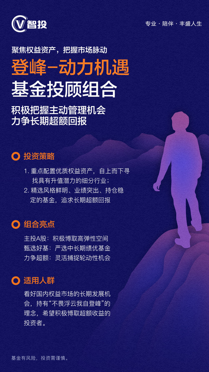 总的来说,景顺长城V智投-登峰-动力机遇组合高权益仓位运作,立足A股市场,精选风格稳定、中长期绩效优秀的基金;根据市场情况灵活调整组合持仓,捕捉行业及风格轮动机会。投资者可将本组合作为自身资产配置中,主投A股市场部分的解决方案。