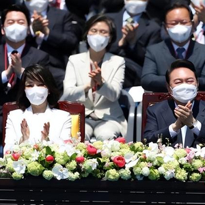 当地时间5月10日,尹锡悦正式就任第二十届韩国总统,并于当天上午在首尔汝矣岛的国会议事堂举行就职典礼。图为就职仪式上的尹锡悦与夫人金建希。 中新社发 YANG DONG WOOK 摄