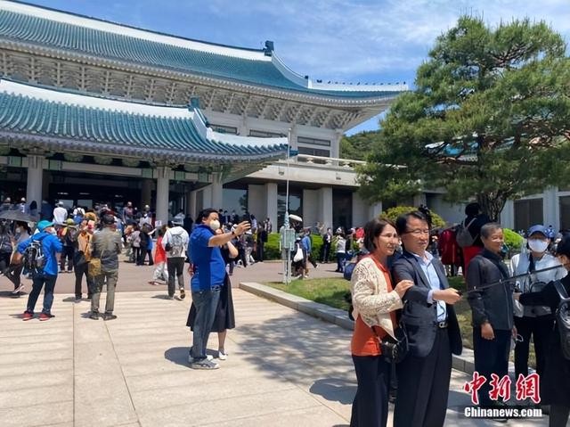当地时间5月10日,韩国青瓦台时隔74年首次向公众全面开放。图为参观者们在青瓦台本馆前自拍合影留念。 中新社发 刘婧妮 摄