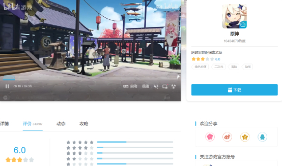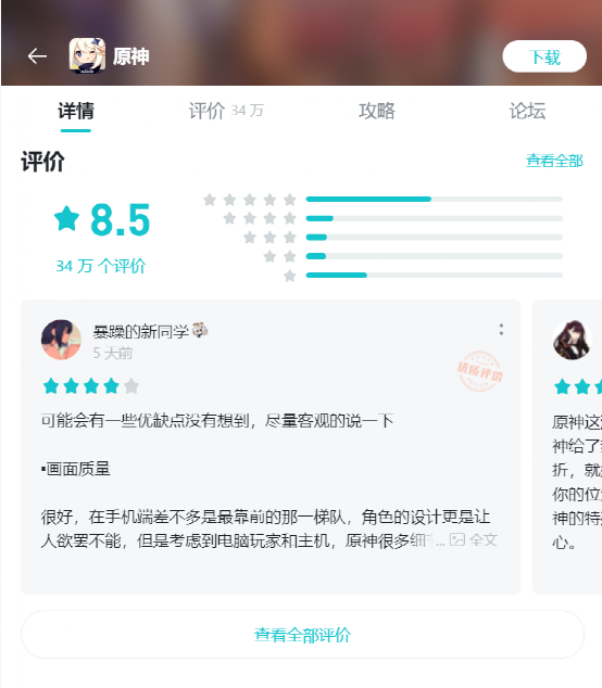 除了主机和单机游戏之外,手游玩家也需要有自己的发声渠道。国内手游社区TapTap和B站的游戏中心都为手游玩家们提供了用户评测的功能。以二次元手游《原神》为例,在TapTap上有超过34万名玩家为这款游戏打分留下评论,在B站《原神》也收获了同样数量的玩家评测。