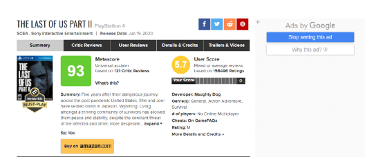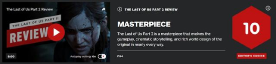 2020年,知名游戏评分媒体IGN为当时轰动整个游戏圈的大作《最后生还者2》打出了10分满分,称其为本世代的杰作。