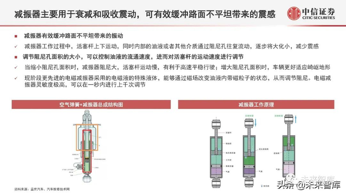 当缩小阻尼孔面积时,减振器阻尼大,活塞杆运动慢,有利于高速平稳行驶;增大阻尼孔面积时,车辆更好适应崎岖地形;现阶段更先进的电磁减振器采用的电磁液的特殊液体,能够通过磁场改变油液内带磁粒子的状态,从而调节阻尼。电磁减 振器灵敏度极高,可以在一秒内进行上千次调节。