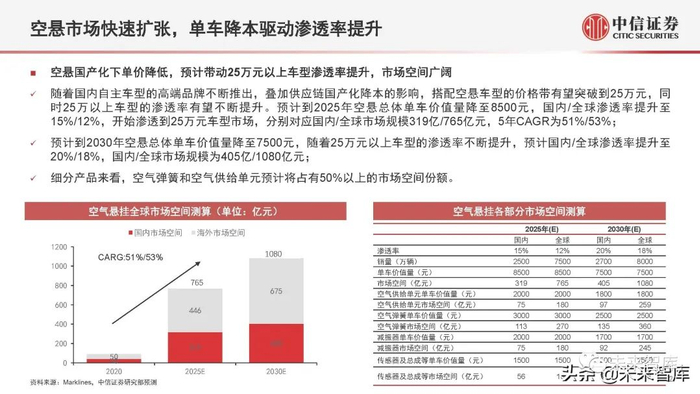 预计到2030年空悬总体单车价值量降至7500元,随着25万元以上车型的渗透率不断提升,预计国内/全球渗透率提升至 20%/18%,国内/全球市场规模为405亿/1080亿元;