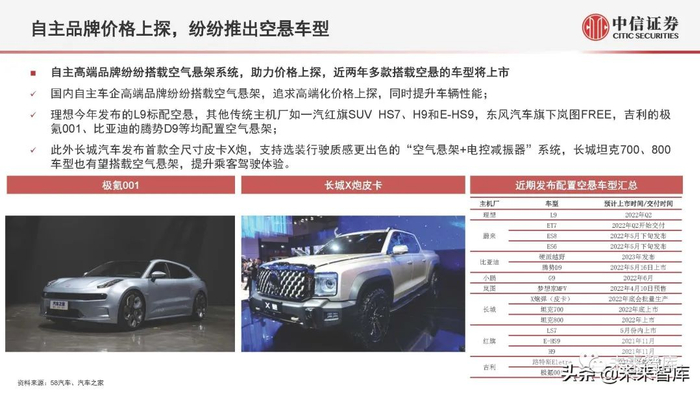 自主高端品牌纷纷搭载空气悬架系统,助力价格上探,近两年多款搭载空悬的车型将上市