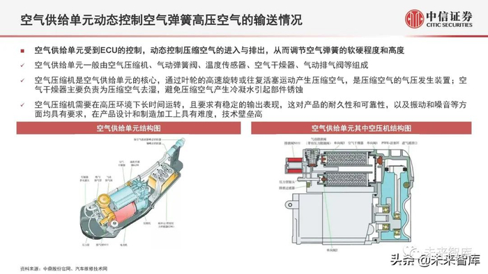 空气供给单元一般由空气压缩机、气动弹簧阀、温度传感器、空气干燥器、气动排气阀等组成 ;空气压缩机是空气供给单元的核心,通过叶轮的高速旋转或往复活塞运动产生压缩空气,是压缩空气的气压发生装置;空 气干燥器主要负责为压缩空气去湿,避免压缩空气产生冷凝水引起部件锈蚀;空气压缩机需要在高压环境下长时间运转,且要求有稳定的输出表现,这对产品的耐久性和可靠性,以及振动和噪音等方 面均具有要求,在产品设计和制造加工上具有难度,技术壁垒高。
