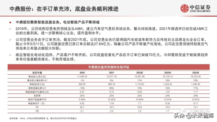 公司空悬业务在手订单充沛,截至2021年底,公司空悬业务已取得国内多家造车新势力及传统自主品牌龙头企业订单, 截止今年5月11日,公司披露空悬已获订单总额达27.64亿元。随着公司产品不断量产化落地,公司在空悬领域特别是空气 供给单元有望占据较大份额;