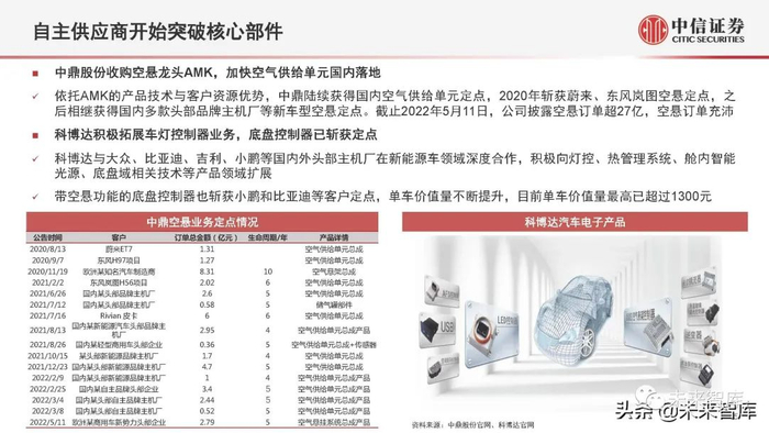 依托AMK的产品技术与客户资源优势,中鼎陆续获得国内空气供给单元定点,2020年斩获蔚来、东风岚图空悬定点,之 后相继获得国内多款头部品牌主机厂等新车型空悬定点。截止2022年5月11日,公司披露空悬订单超27亿,空悬订单充沛 。