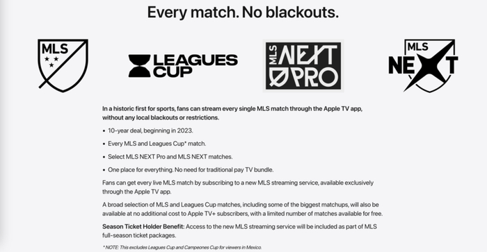 依据协议,这些比赛将都在Apple TV+上进行独家流媒体播出,购买了这个观赛包服务的球迷与Apple TV+的订阅用户(每月4.99美元),都可以收看到全部比赛场次的直播。此外,Apple TV还将放出一些精选比赛,作为免费场次供非订阅球迷收看。