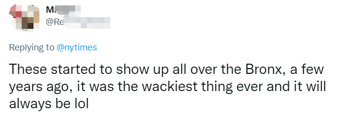 “几年前,这些东西开始出现在布朗克斯区的各个角落,这是有史以来最怪的现象,而且会一直是,哈哈哈。”