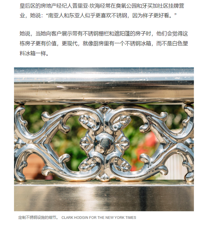 皇后区的房产经纪人称,当地的南亚裔和东亚裔移民“似乎更喜欢不锈钢”,“因为样子更好看”,客户觉得带有不锈钢栅栏和遮阳棚的房子“更有价值,更现代”。