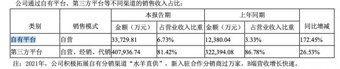原本水羊股份线上销售渠道以天猫、淘宝、京东、唯品会、拼多多等互联网电商平台为主,如今戴跃锋发力“御泥坊-官方直营商城”“水羊潮妆”“水羊直供”等自有平台,其销售收入占营收比重,也从2020年的3.33%增至6.73%。