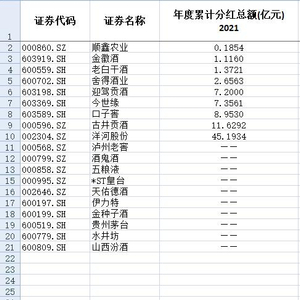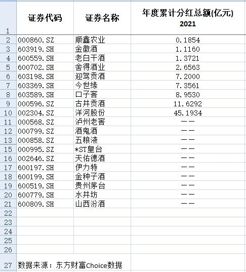 Choice数据显示,19家上市白酒企业中,有9家公布了2021年度累计分红总额。其中,洋河股份(002304.SZ)分红总额达到45亿元,是已公布分红总额最多的上市白酒企业;而顺鑫农业(000860.SZ)只有0.18亿元,在9家已公布分红总额的酒企中数额最少。