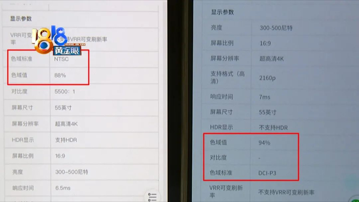 记者把两个链接的参数进行对比,发现商品编号不一样,上市时间差了两个月,显示参数中的色域标准和色域值不一样,核心参数一样,外观设计中的屏占比也不一样。