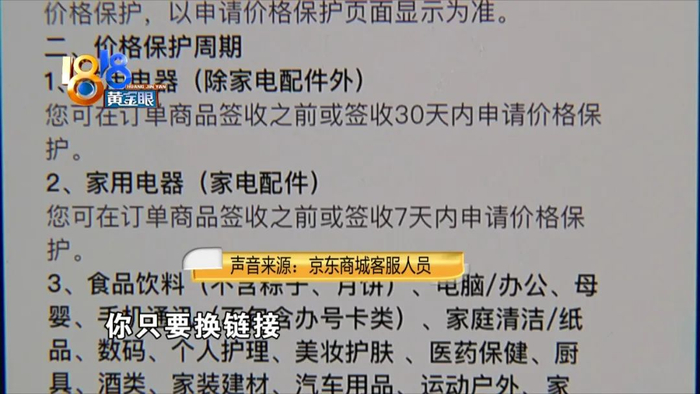 京东商城客服人员:“(葛先生:你把我原来那个订单的链接下掉,重新上了个链接,然后你跟我说不能价保,那我换句话说,你618价保30天干嘛呢?是不是?你只要换链接。)您原来的订单是由于无货了,原来的那个链接无货了,所以说现在无法进行下单。(葛先生:那同一个店铺为什么同一台电视机还在售呢?)可能是从不同商铺调货的,也可能是其它情况。”