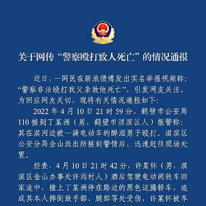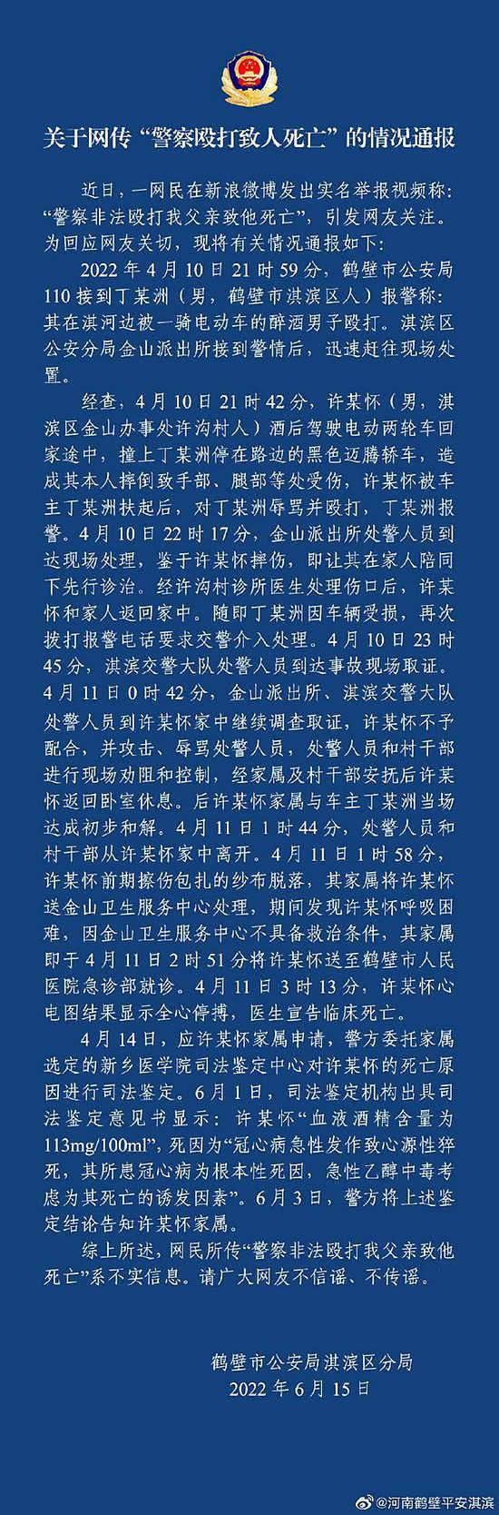 6月15日,河南鹤壁平安淇滨发布通报称:网传“警方非法殴打我父亲致他死亡”系不实信息。“许某怀酒后驾驶电动两轮车回家途中,撞上丁某洲停在路边的黑色迈腾轿车,造成其本人摔倒致手部、腿部等处受伤”,其死因为“冠心病急性发作致心源性猝死”。