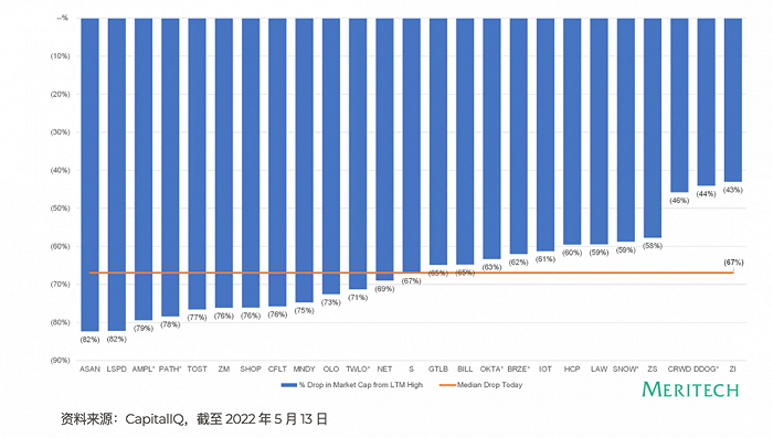 截至2022年5月13日,美股过去12个月年营收增速最快的25家SaaS公司,公司股价从最高点到现在下滑的百分比,最高达82%,平均为67%。