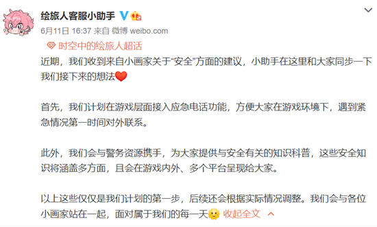 更为可贵的是,在唐山恶性事件后,《恋与制作人》《时空中的绘旅人》相继宣布将会研发“安全功能”,希望能提升玩家的一点点安全感。