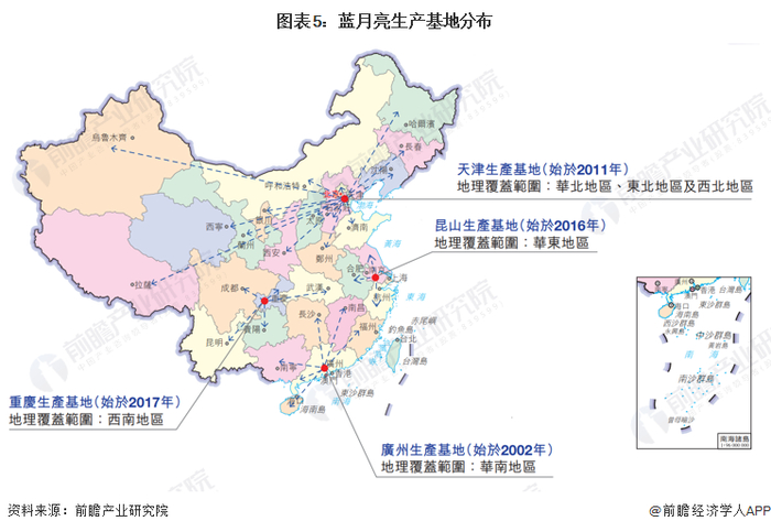 蓝月亮集团的销售网络覆盖全中国,为方便产品运输、保证产品供应,蓝月亮在全国建立了天津、昆山、重庆和广州四大生产基地。其中天津生产基地负责整个北方地区的产品供应,昆山生产基地负责华东地区产品供应,重庆生产基地负责西南地区产品供应,而广州生产基地负责华南地区产品供应。