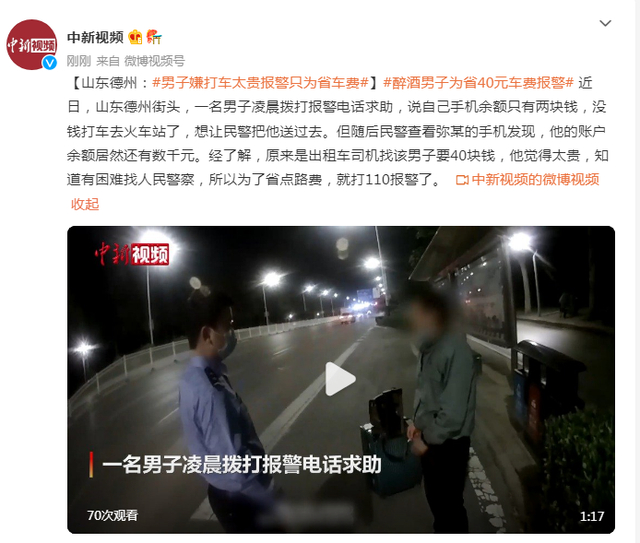 山东德州:醉酒男子为省40元车费报警 网友:真奇葩