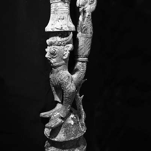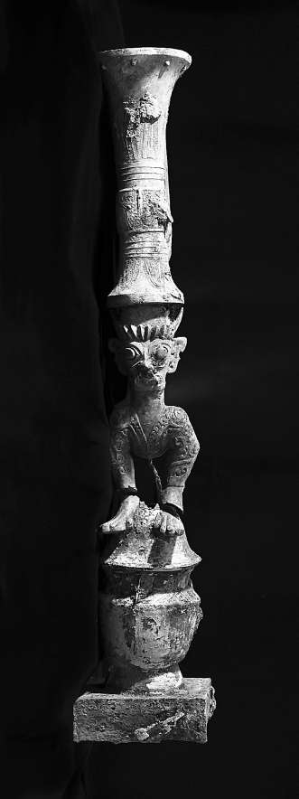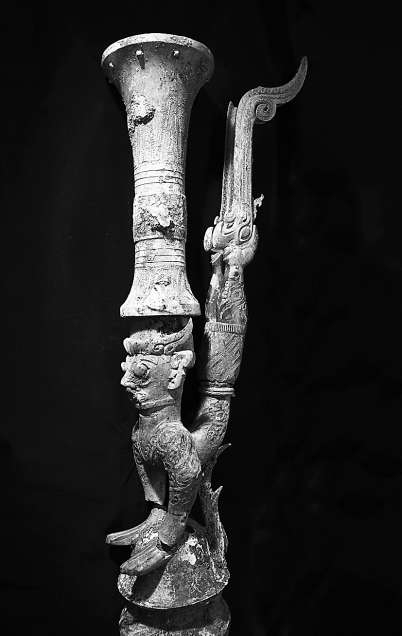 “这不是人像,应当是神像。”现场见证两件文物“合璧”的专家无不惊叹。“合璧”而成的这件鸟足曲身顶尊神像,头顶尊、手撑罍、脚踏鸟,身体向后翻起,完成了一个高难度“动作”,反映了当时祭祀行为中非常重要的仪式、行为。五绺立发的人像造型,与之前三星堆发现的辫发铜人像和髻发铜人像不同,可能代表着三星堆又一种身份的人群。