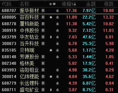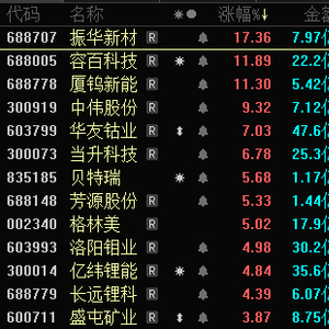 今日(17日),三元正极材料板块强势上涨,截至收盘,振华新材涨超17%,容百科技、厦钨新能涨超10%,中伟股份、华友钴业、当升科技等跟涨。
