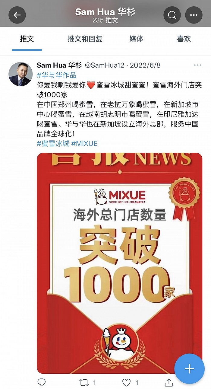蜜雪冰城悄无声息地在东南亚张开了巨网。上海华与华营销咨询有限公司自2018年起为蜜雪冰城提供品牌咨询服务,其董事长华杉于6月8日在社交平台上发文,表示蜜雪冰城海外门店已突破1000家。