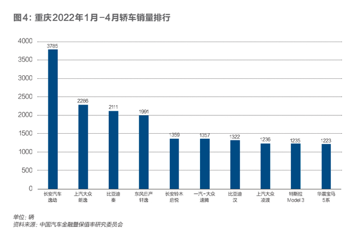 中国汽车金融暨保值率研究委员会的新车上险量数据显示,2022年前四个月,重庆销量最高的十款SUV车型,累计上险量21695辆,销量前十名中的轿车累计销量则只有17905辆,前者比后者多21.2%。2021年,重庆车市也呈现出类似的情况,销量前十的SUV和轿车分别为66008辆和56853辆,相差16.1%。