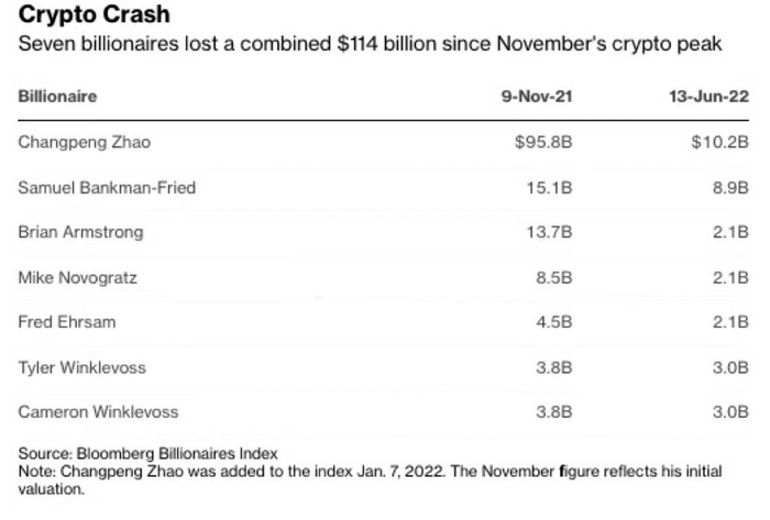 根据彭博亿万富豪指数,近期与加密货币有关的七位亿万富豪总共损失了1140亿美元。损失最惨重的就是世界最大加密货币交易所币安创办人赵长鹏。