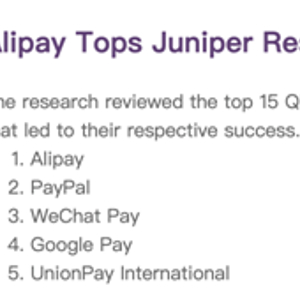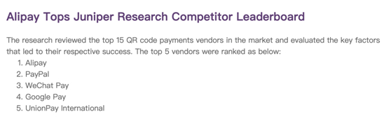 近期,英国市场调研公司(Juniper Research)发布了一项二维码支付的调研报告,评估了全球市场15家知名数字支付公司,其中,支付宝居首位。报告预测,到2025年,全球通过二维码支付的消费会超过3万亿美元。