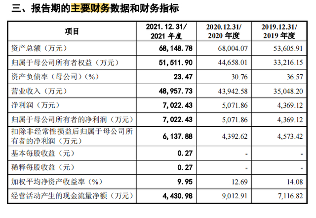 其2019-2021年的营收分别为3.5亿元、4.4亿元 和4.9亿元,净利润为0.43亿元、0.51亿元和0.7亿元。其中,21系列产品的销售收入占主营业务收入的比重分别高达94.39%、91.32%和86.70%。