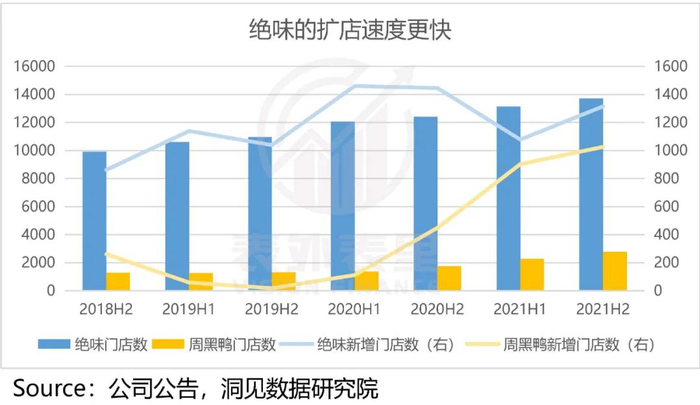 这反馈在数据上,就是绝味比周黑鸭扩张得快多了。如下图,前者几乎每一年的新开店面数量,都和后者的总店面数量差不多。