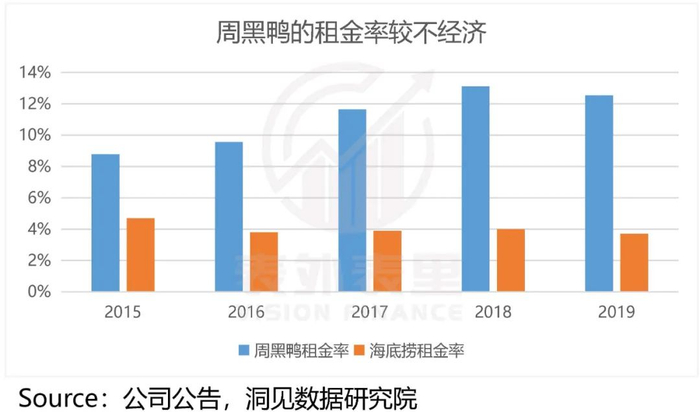 当然,如果有强大的品牌力加持,高昂的租金可以通过终端高消费收入来摊平。比如,以品牌力获得终端溢价的海底捞,其租金率在同期,常年维持在4%以下。而周黑鸭显然不属于这个行列。