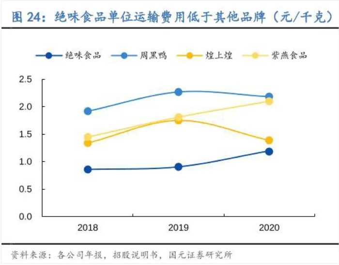 而在单位运输成本上,绝味是行业最低,周黑鸭是最高的。
