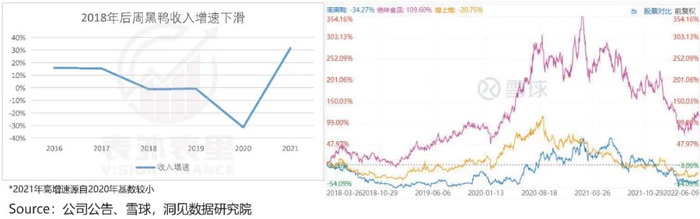 幻象坍塌,市场马上翻脸。可以看到,2018年之后,走高端路线的周黑鸭,股价一直被大众化的绝味压制。