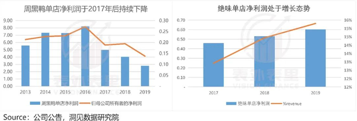 可以看到,2019年之前主要发力自营模式的周黑鸭,单店净利率是逐年下滑的;相比之下,主打加盟模式的绝味,却是向上的。